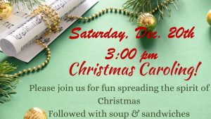 - Saturday, December 20th – Christmas Caroling followed by soup supper